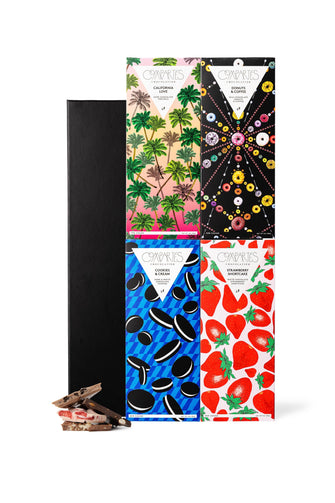 Our brand new Best Selling Chocolate Bar Gift set features our most popular gourmet Chocolate bars (Jonathan's Favorites) in one set. Get our oreo cookies and cream, strawberry shortcake, donuts and coffee and california Love in this best selling chocolate bar combo set thats the ultimate gift. Never tried Compartes? Want our greatest hits? This box is for you! Tried them before, then you know these ones are some of our best selling chocolate bars of all time. Hurry, this box won't last long! The ultimate chocolate holiday gift, work from home gift and family gift for friends and family worlwide!