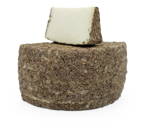 The Chevre au Romarin hails from Castilla La Mancha, a region in Spain that is known for its long ancestry in cheese-making. It offers a visual contrast between the classically white paste of goat’s milk and the mossy green of its rosemary coating. Aged for a minimum of 5 months, the maturing process for the Chevre au Romarin gives it a firm texture while retaining a creamy mouthfeel. The rosemary rind seeps through to the interior of the cheese, offering a flavour that is distinctly herbaceous with sweet and lactic goats milk notes that linger on the finish.