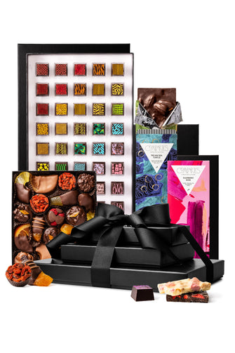 Featuring our gorgeous 40 piece truffles gift box, a Premium 2 Bar Gift Set, plus a medium gift box of chocolate covered fruits, like chocolate apricots, chocolate orange peels and many more.