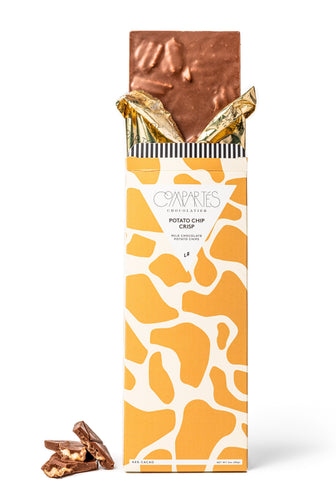 Compartés Potato Chip Crisp gourmet milk chocolate bar is the perfect blend of salty and sweet. We take Compartés signature creamy milk chocolate and toss in tons of salted and crispy potato chips, broken in all sorts of different sizes so the bar is completely crunchy and texturized.